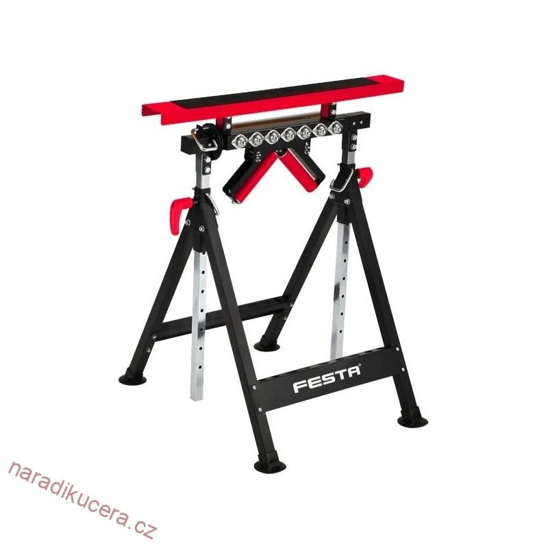 4. rolovací koza / podpěra s válečky s možností z vodorovné polohy přenastavit do polohy V - pro bezpečnější práci s kulatinou, hranoly a podobnými profily proti sesmeknutí - nosnost max 45 kg